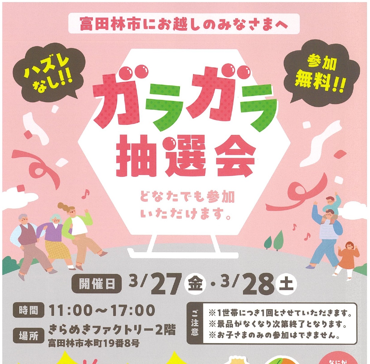 ハズレなし、参加費無料のガラガラ抽選会。 コープの野菜をプレゼントします。 主催:大阪いずみ市民生活協同組合 問合せ先:0120-031-001