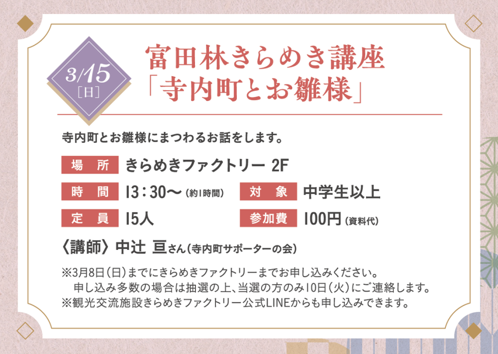 寺内町とお雛様にまつわるお話をします。